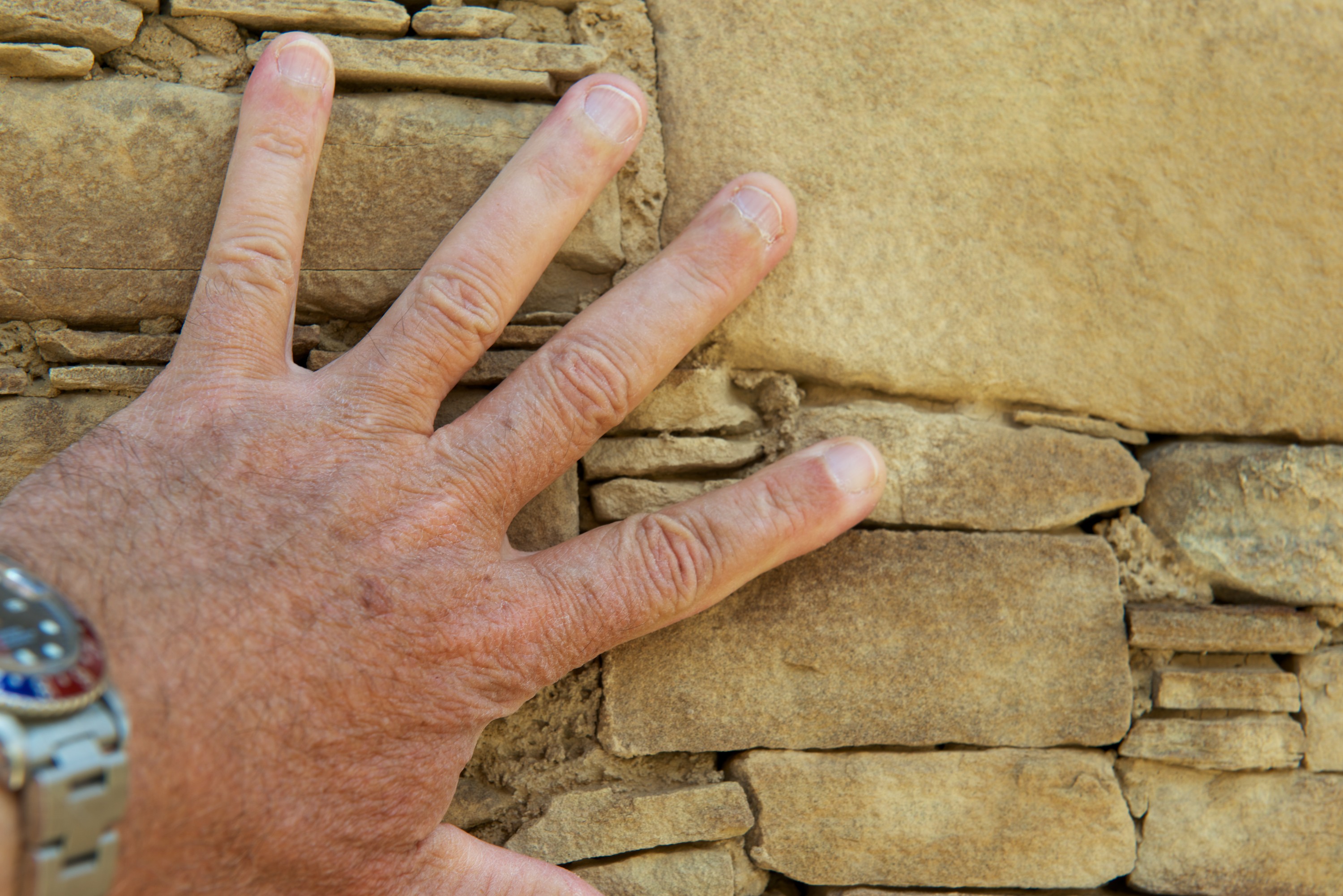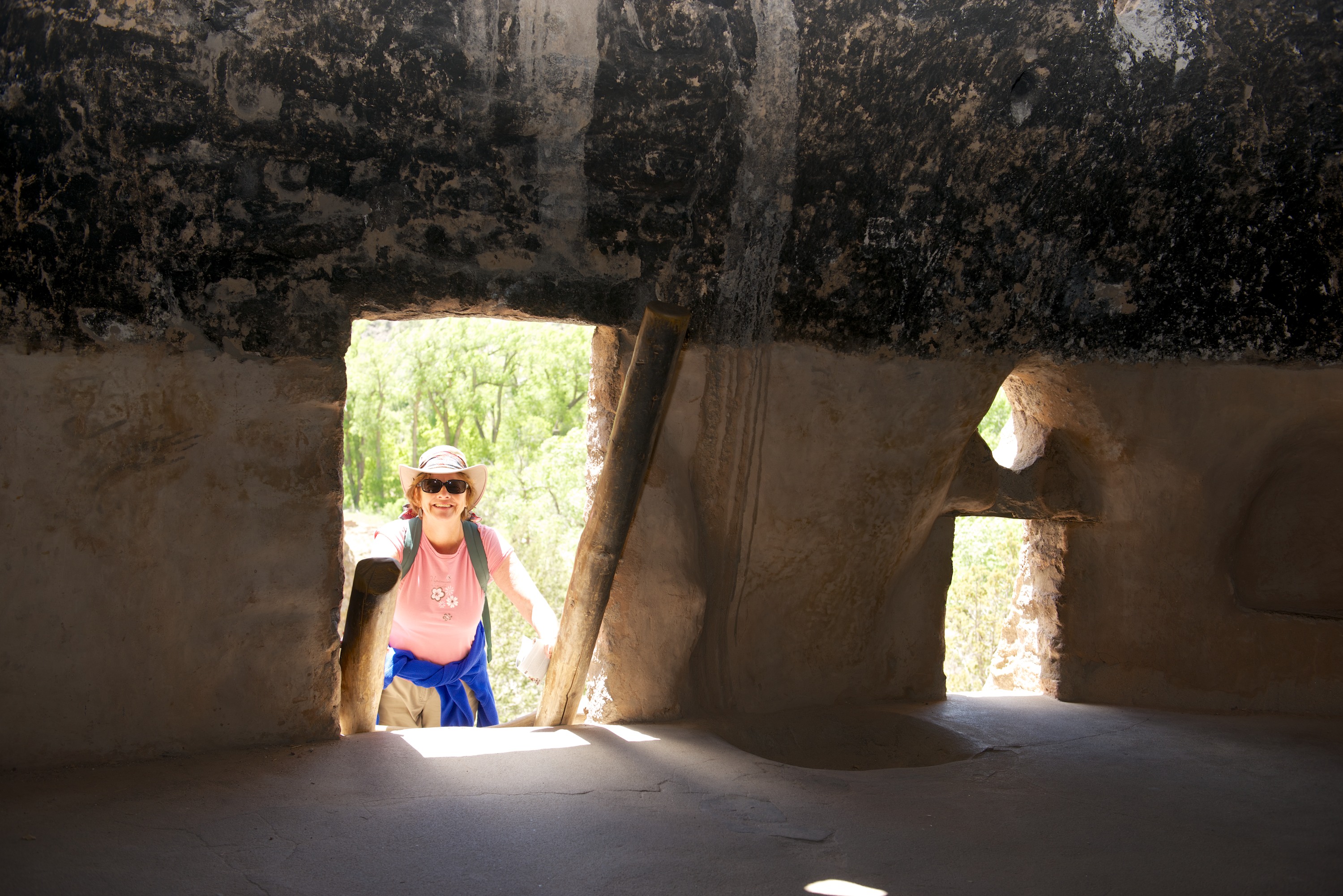 Denise admires an ancestral Puebloan building sheltered by the rocks at the Chaco campground.