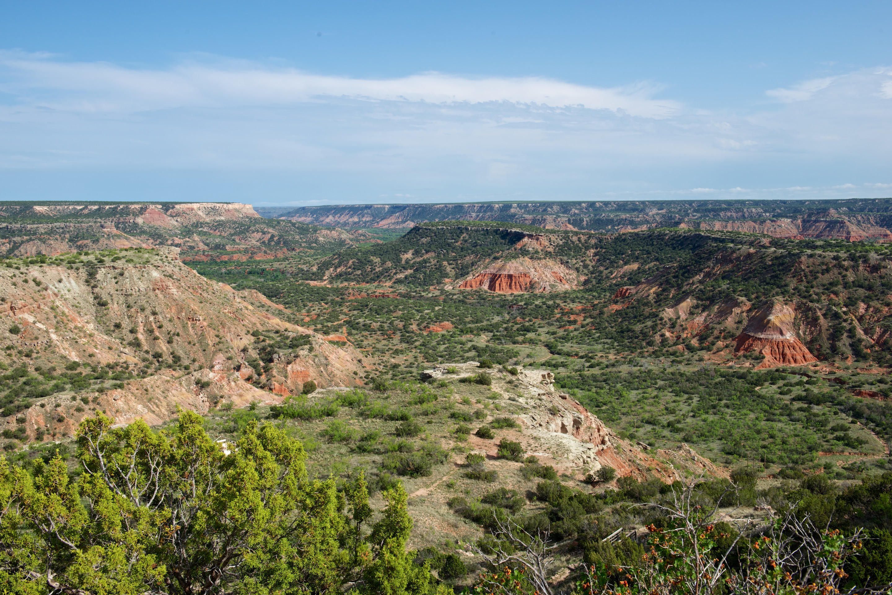 And indeed we drove through a spectacular storm with sheeting rain and lots of thunder and lightning. Fortunately for us, the tornadoes stayed north so we did not have to deal with those. Two cars that had passed us at speed did end up in the ditch (KARMA!) and there was considerable standing water/flooding around the road. We decided that we needed a dose of nature so headed to the Palo Duro State Park and obtained a space in the primitive camping area for two nights. The landscape around Palo Duro is a bit flat: