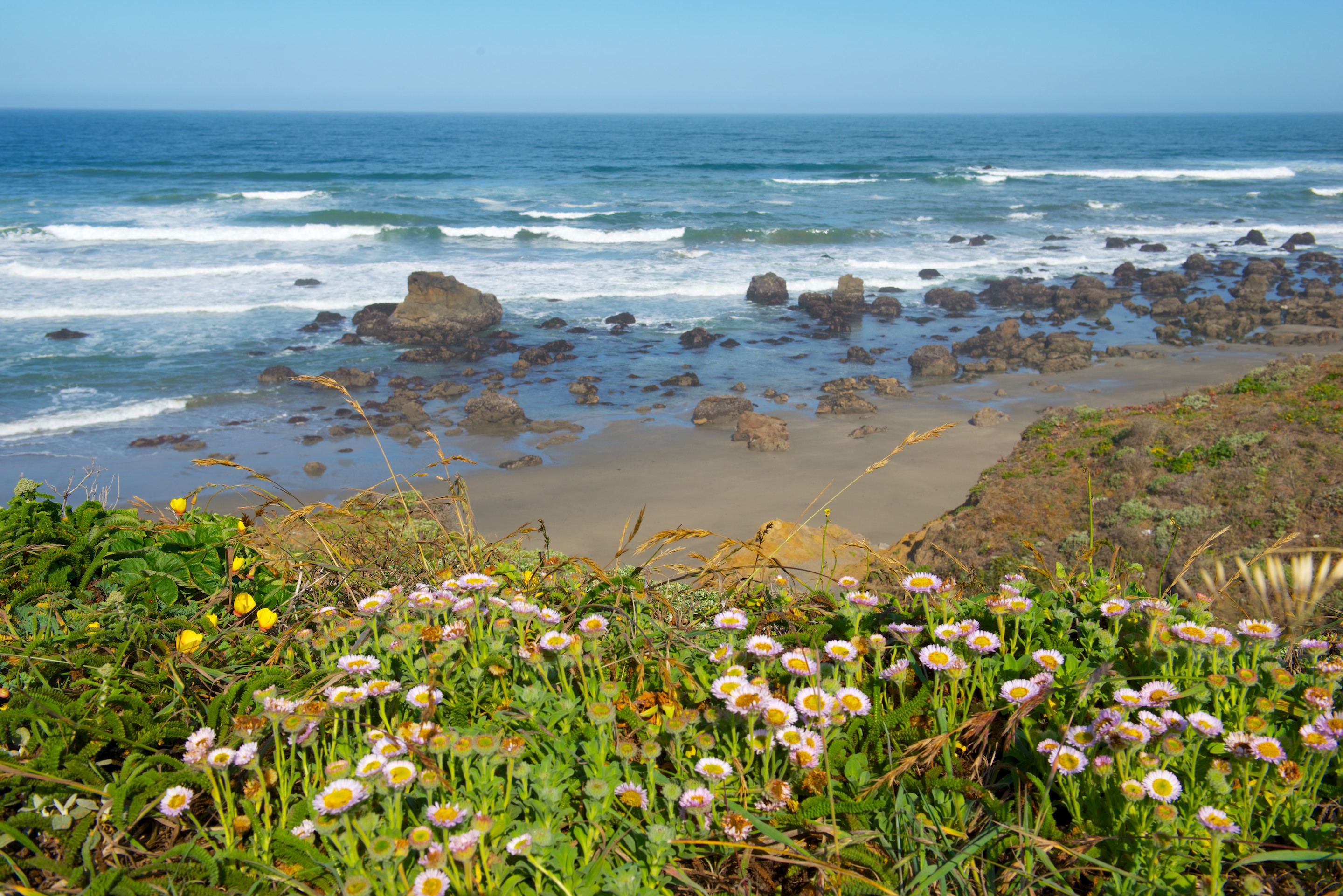 We had a gloomy first afternoon when we walked over the dunes for our first view of a grey and very windy Pacific Ocean at Bodega Bay. Thereafter, however, we had days of glorious sunshine with which to view rock arches and rocky promontories and a beautiful blue ocean. Working our way up the coast, we stopped in the little town of Jenner at the Jenner Inn for coffee and found the most amazing fruit muffins. After voraciously consuming one, we had to buy a second! We also admired the seals (from a distance) basking on the sandy mouth of the river. It is a popular breeding ground and has been somewhat blocked off to provide the seals with some privacy from walkers.