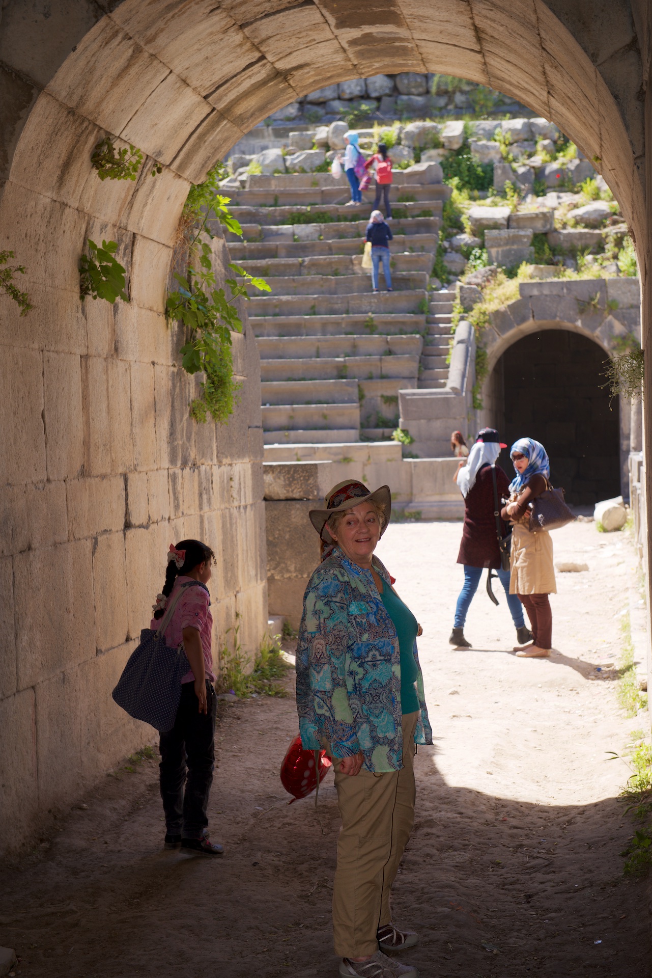 Denise in the tunnel to the stage of a theatre in Gadara.