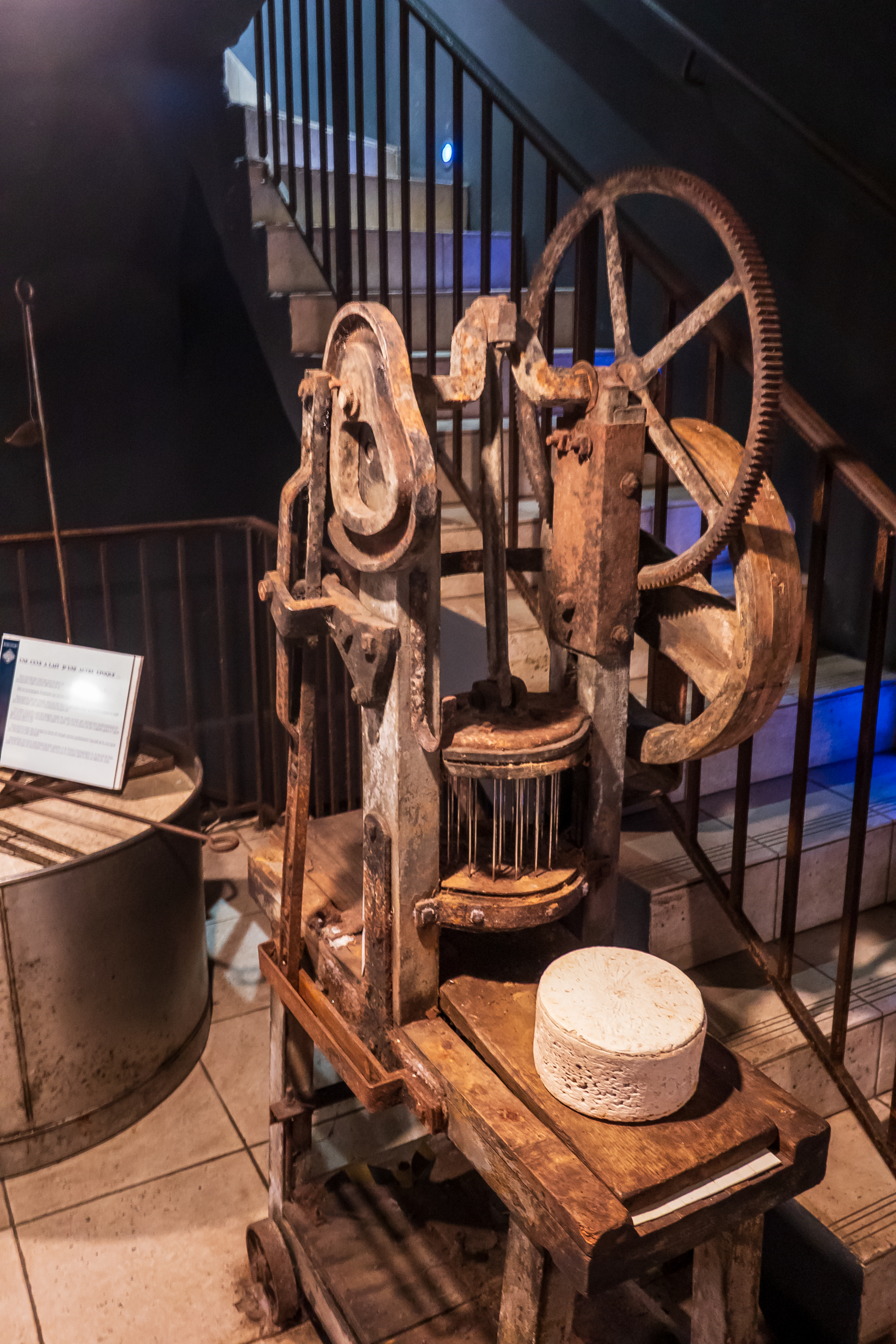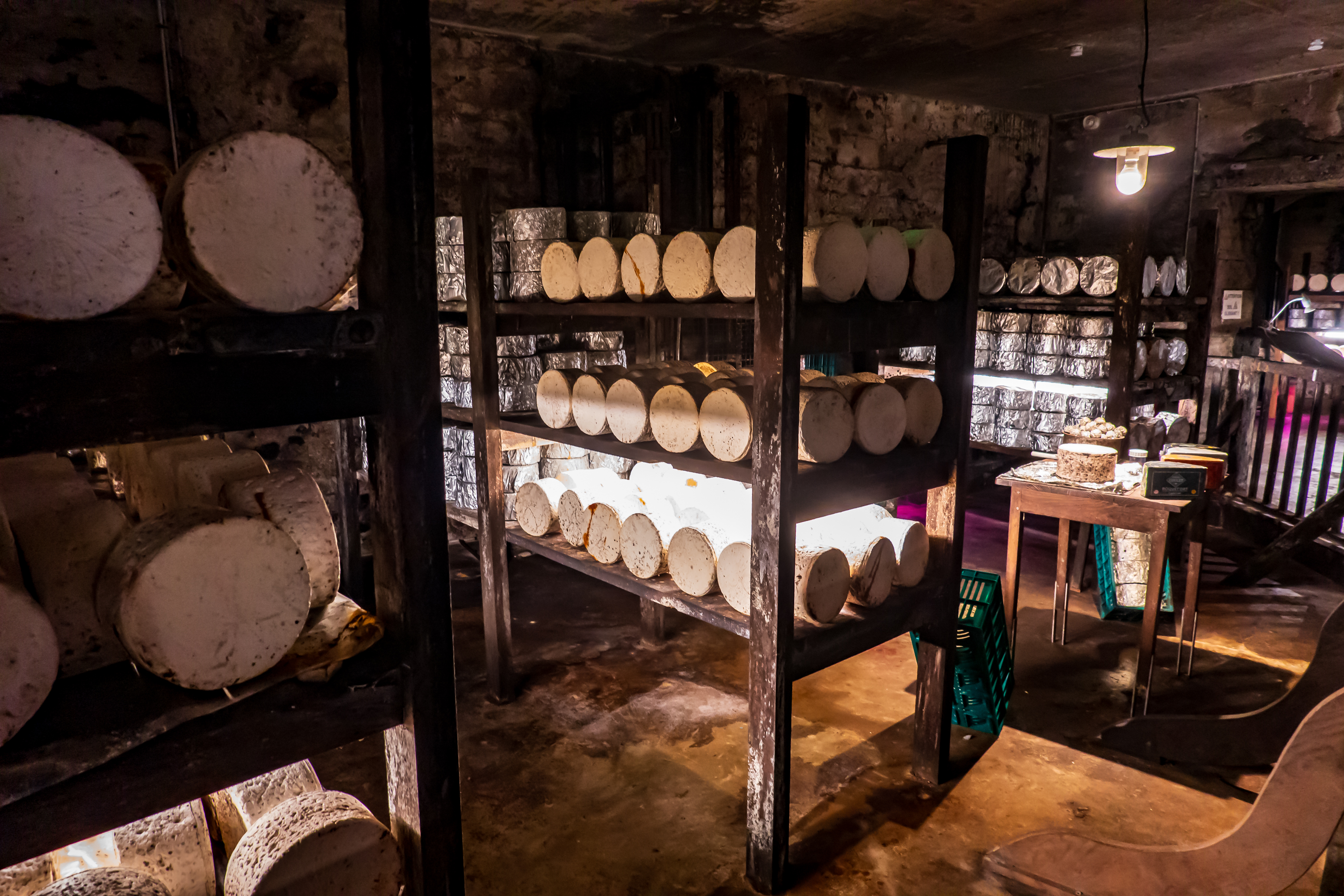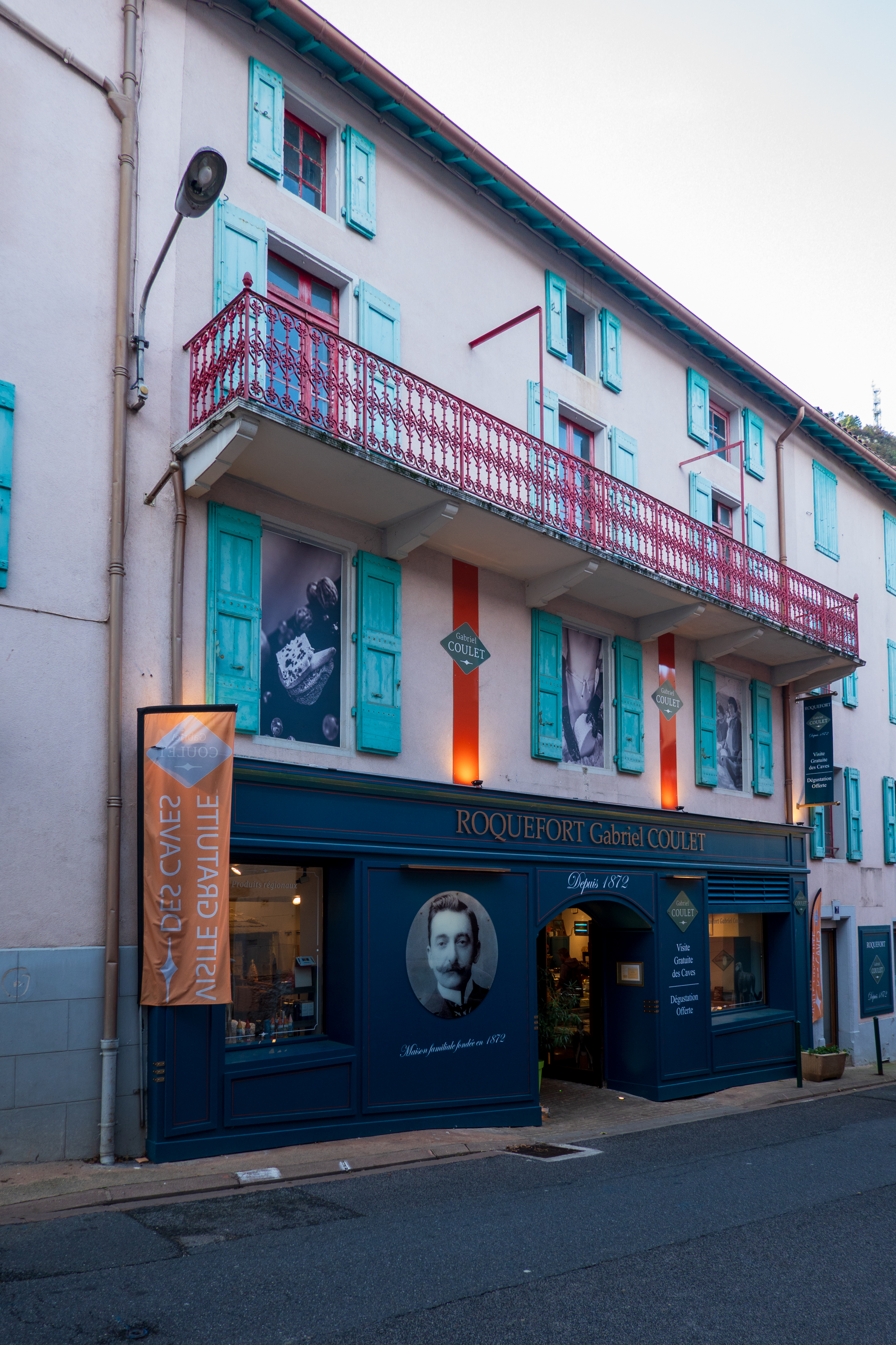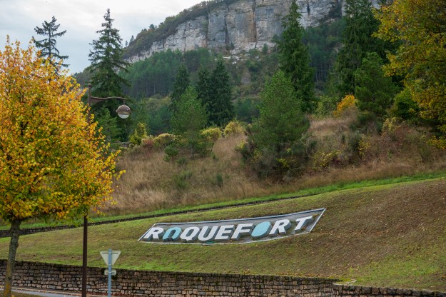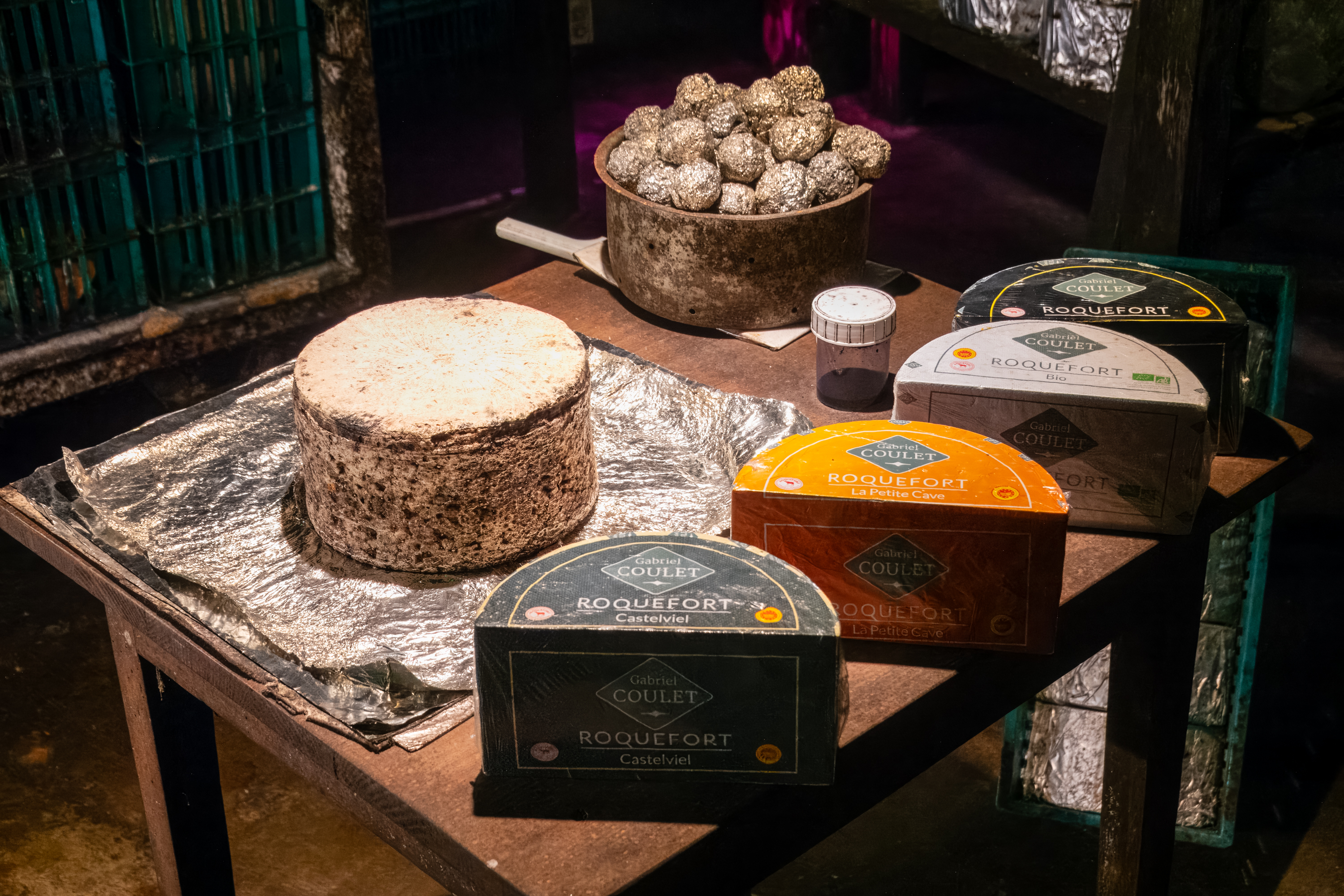 Denise had spent time on an exchange with a French family in this part of France in 1964, so for old times sake, we headed to Roquefort to see the caves and buy some cheese. It was a beautiful dry morning (finally) and we enjoyed the beautiful views we saw, over the valley as we drove the country roads towards Roquefort. As it was Saturday, the town was a lot quieter than we had expected but we parked in the free Aire and then climbed up the steep street towards the top. The place was completely empty and appeared very closed, but then we came upon the Maison Gabriel Coulet, founded in 1872, which was open. We were able to descend to their cave, where a film described the founding of the Maison and the making of Roquefort cheese. We then went into the storage cave where we could see wheels of cheese ageing both in the “visitor” section and in the real cave, which was separated from visitors. The magic of Roquefort cheese is the natural mold spores found in the “fleurine” caves. Fleurines are natural fissures in the cliff while allow air flow into the caves.