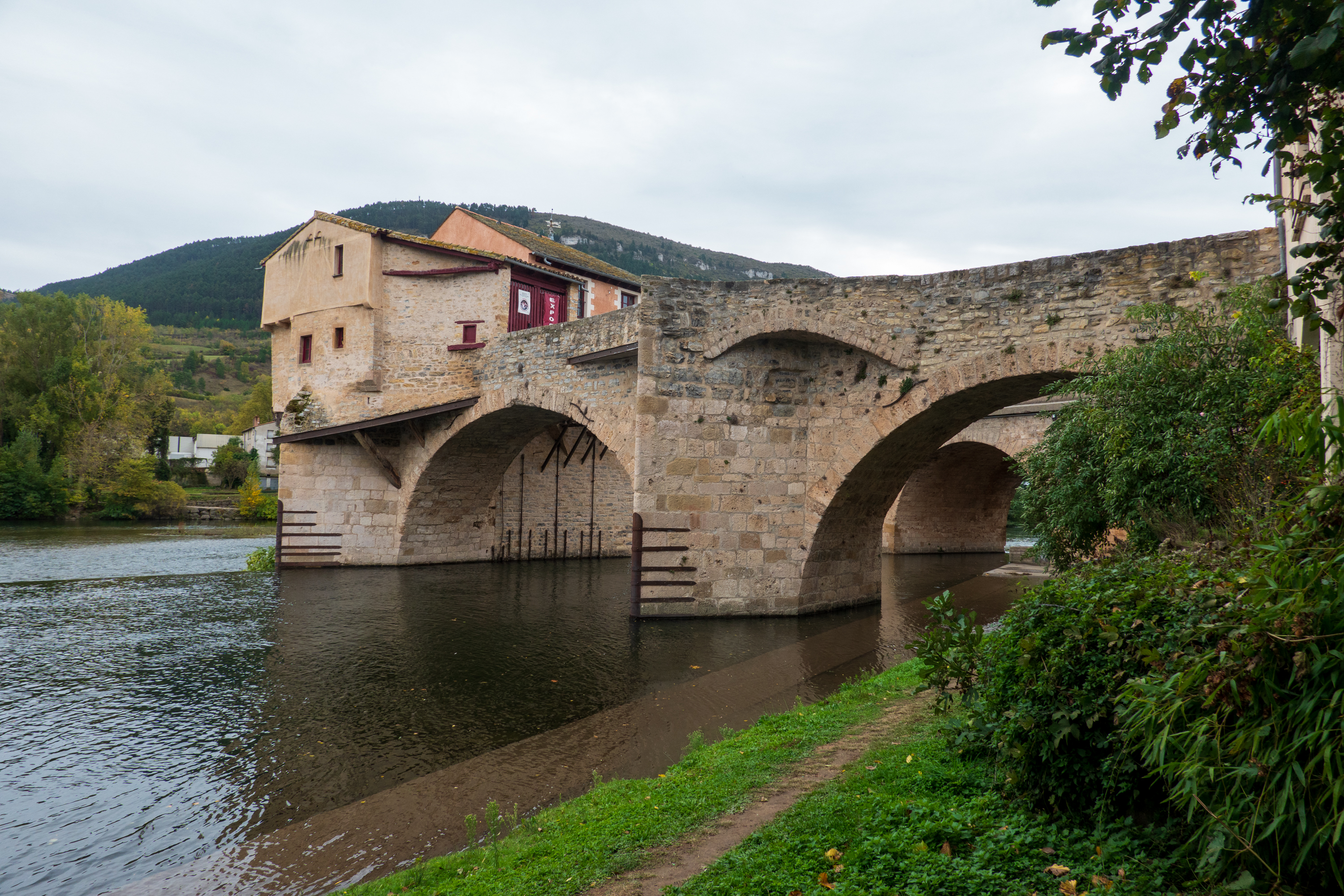 Millau is some 3,000 years old. In Roman times it was a center of earthen ware and in the 19th century it was famous for gloves. Interestingly it was an English town during the Hundred Years War. (Much further south than Fred would have expected.) The old bridge dates from the middle ages when it boasted seventeen arches and three towers. Neglect and floods have reduced it to two arches and one tower/mill – an art museum.