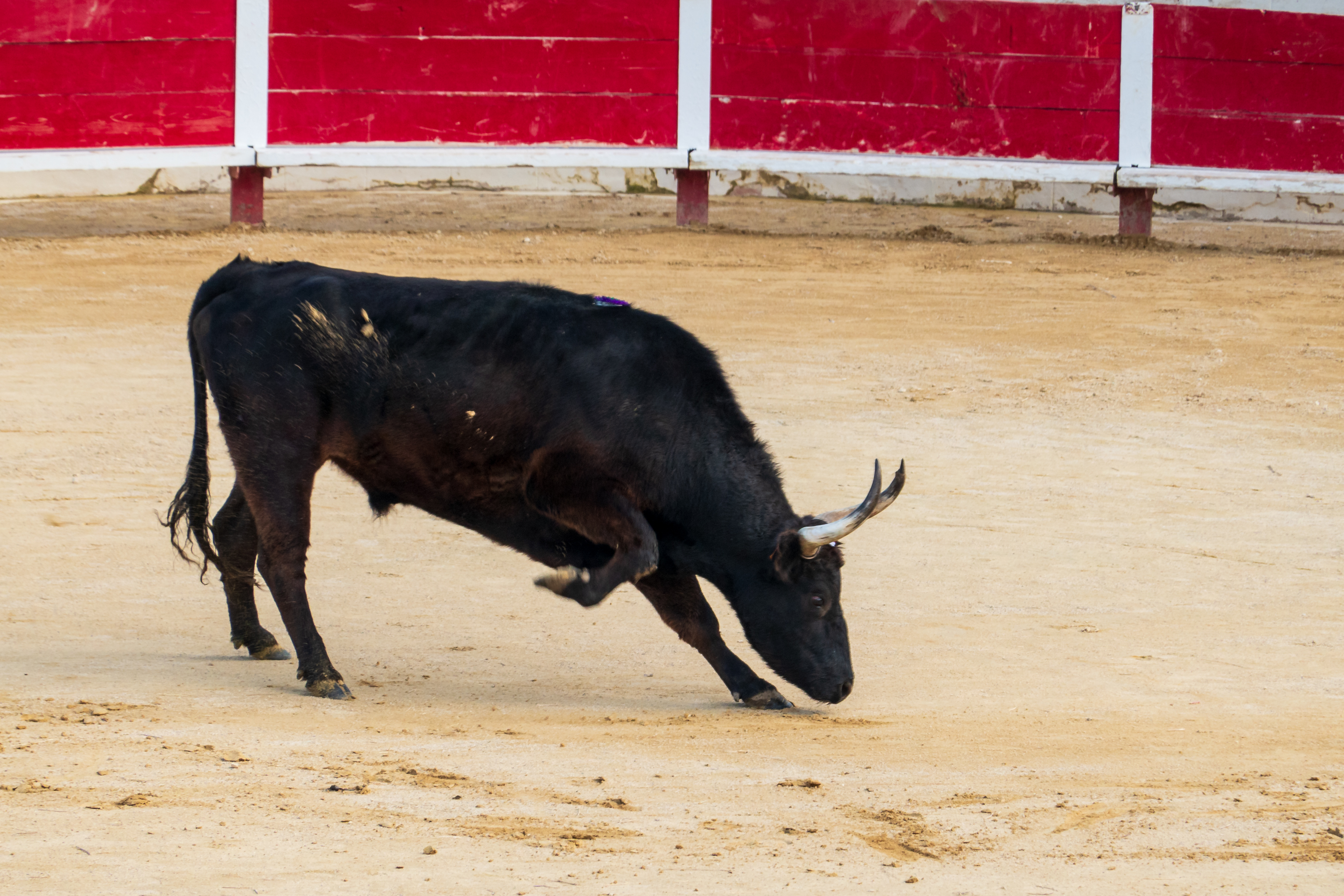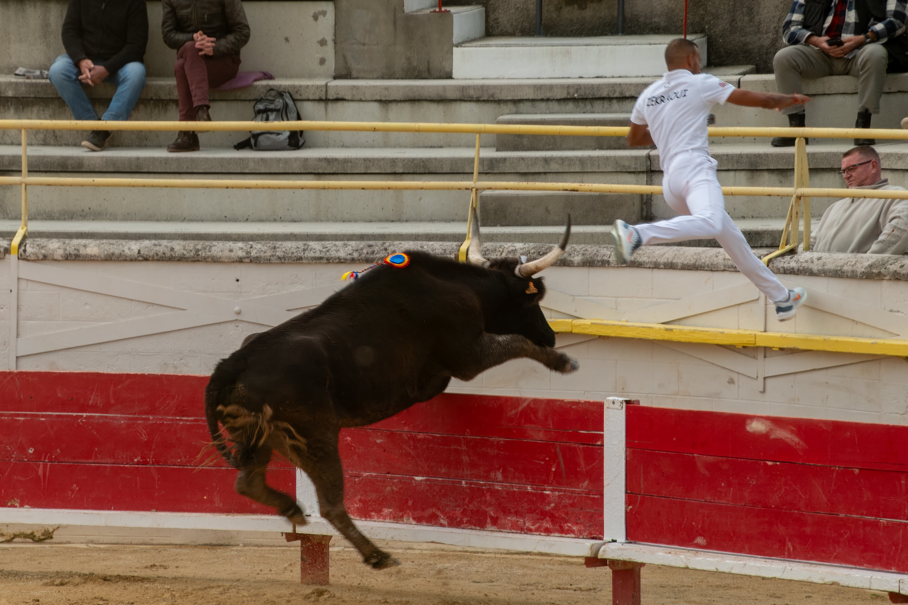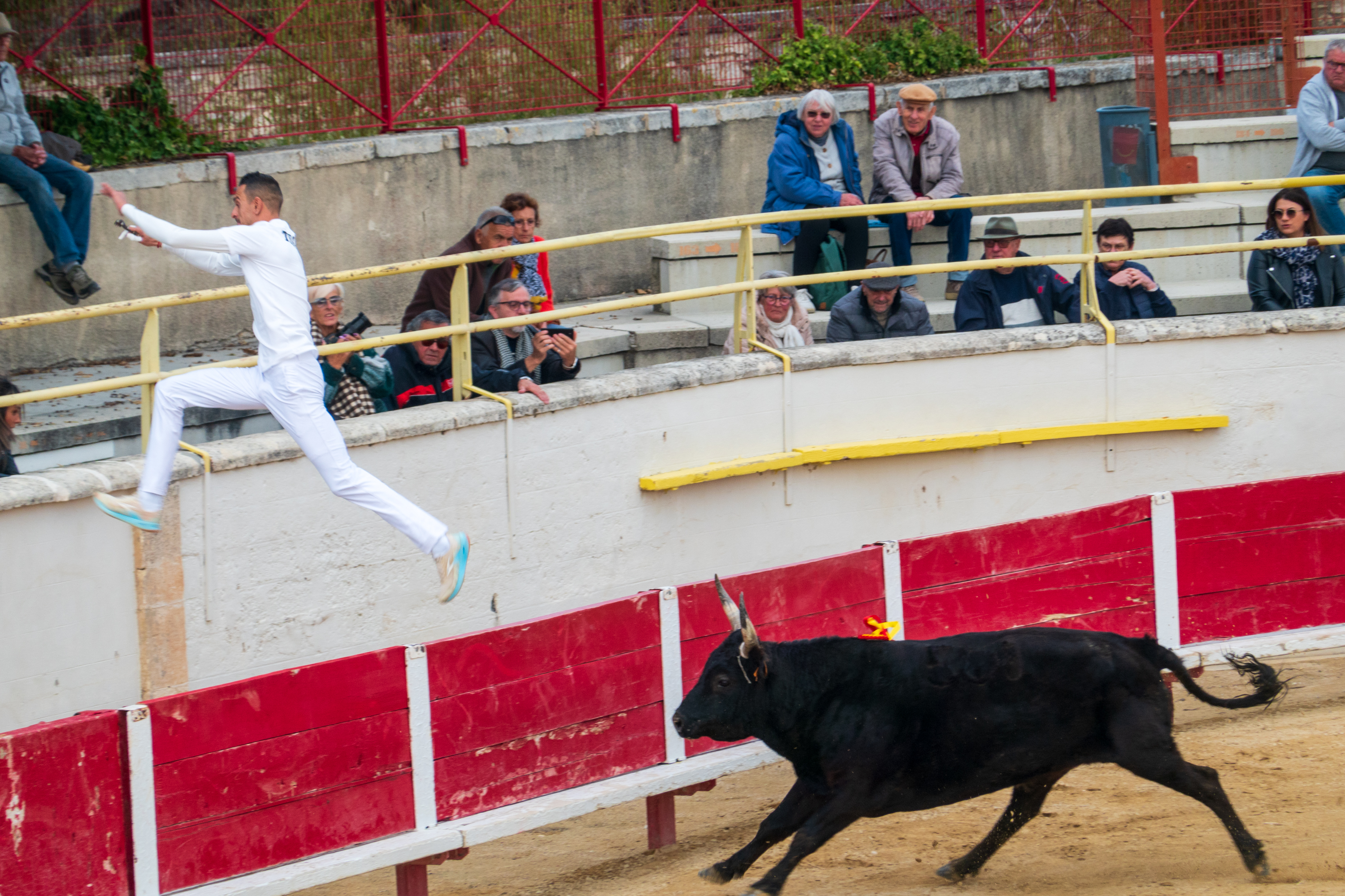 A total of six decorated, and named, bulls would spend 15 minutes each in the ring and the 10 raseteurs would attempt to pull their decorations off, leaping out of the ring as each bull approached.