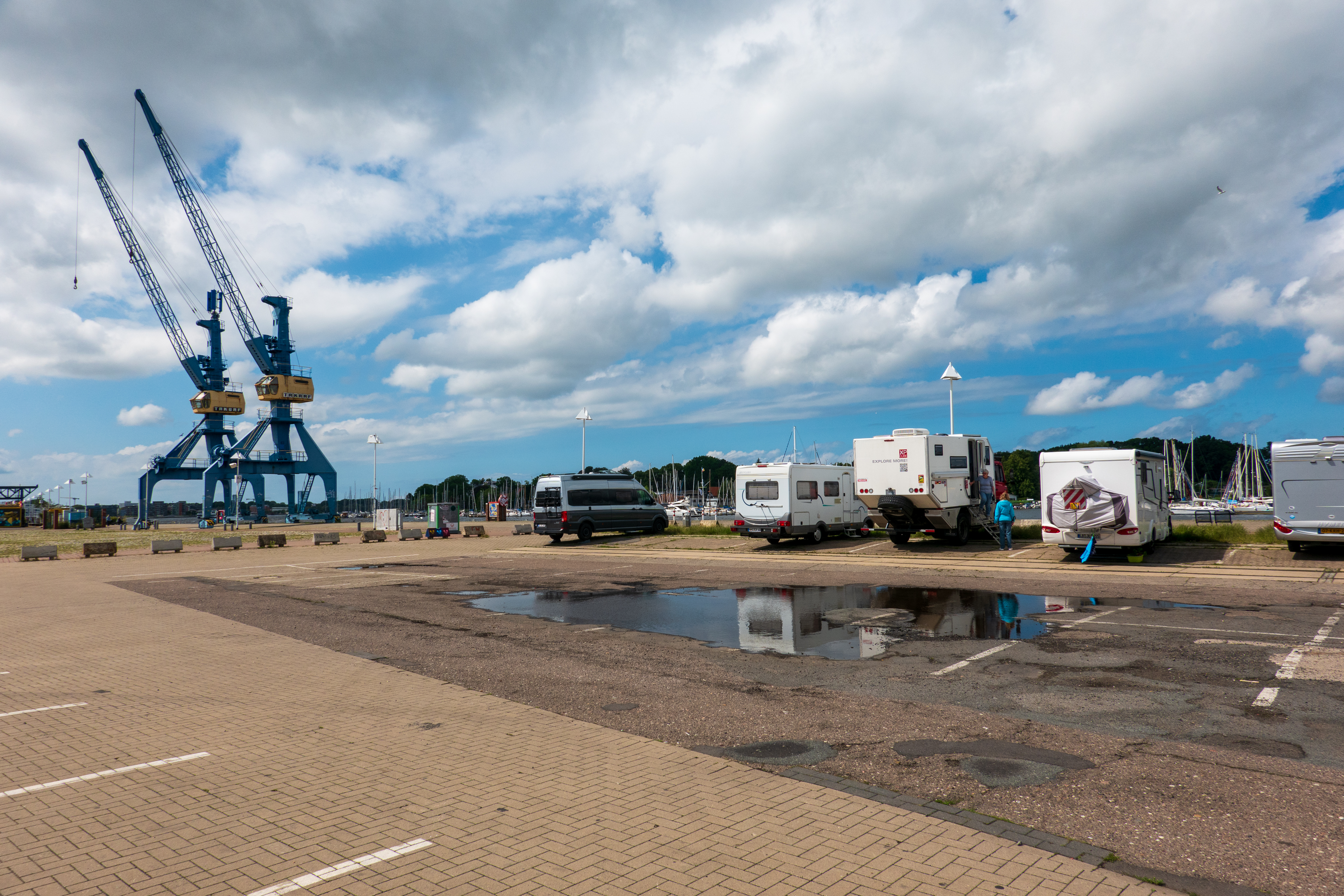 We landed in Rostock and headed for the city parking lot by the port, which accepts campers for a fee. It was a lovely location in easy walking distance of the Old Town and after we were organized (and early enough for a prime waterfront spot), we walked into town to have a look and had a coffee and an apple strudel (shared).