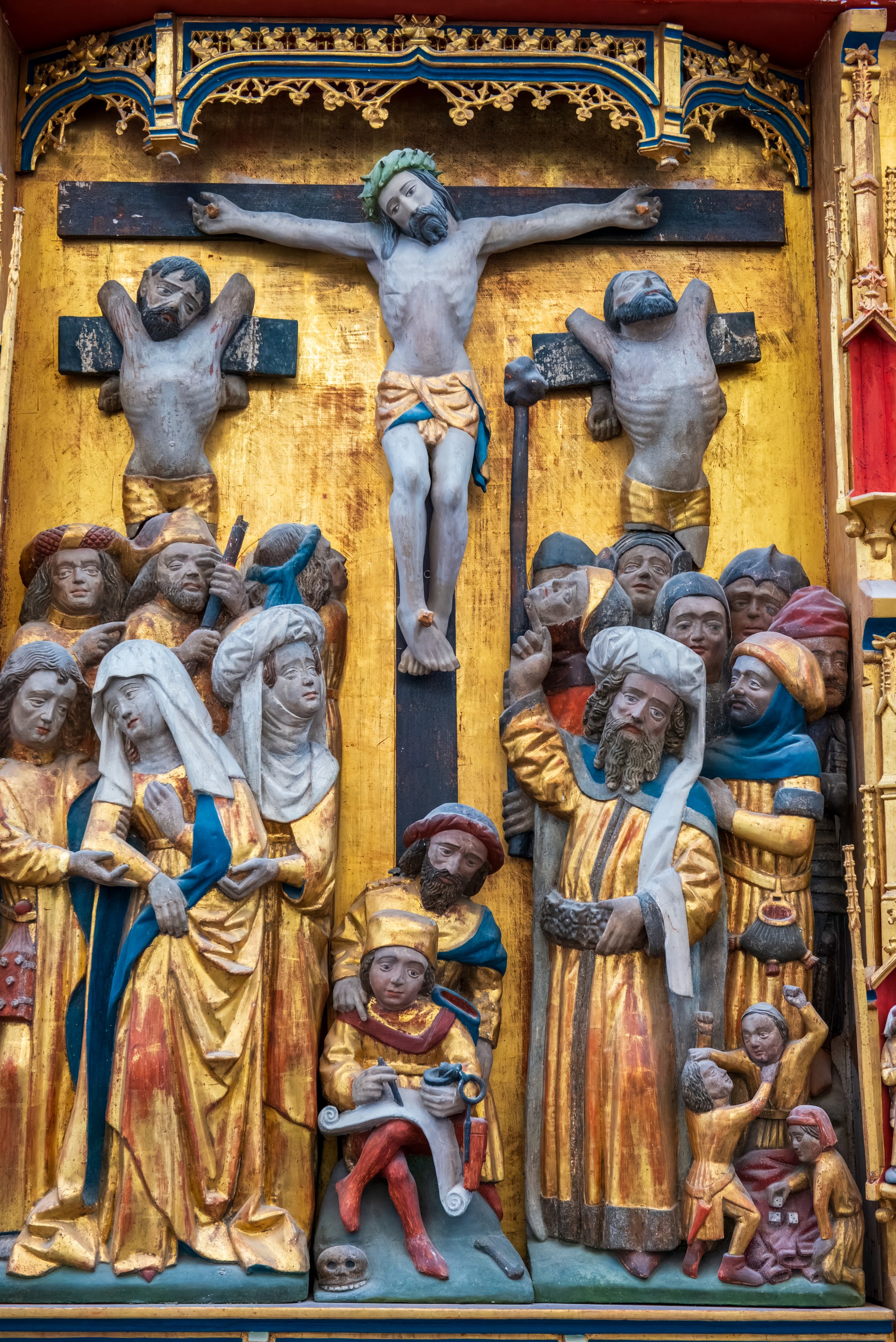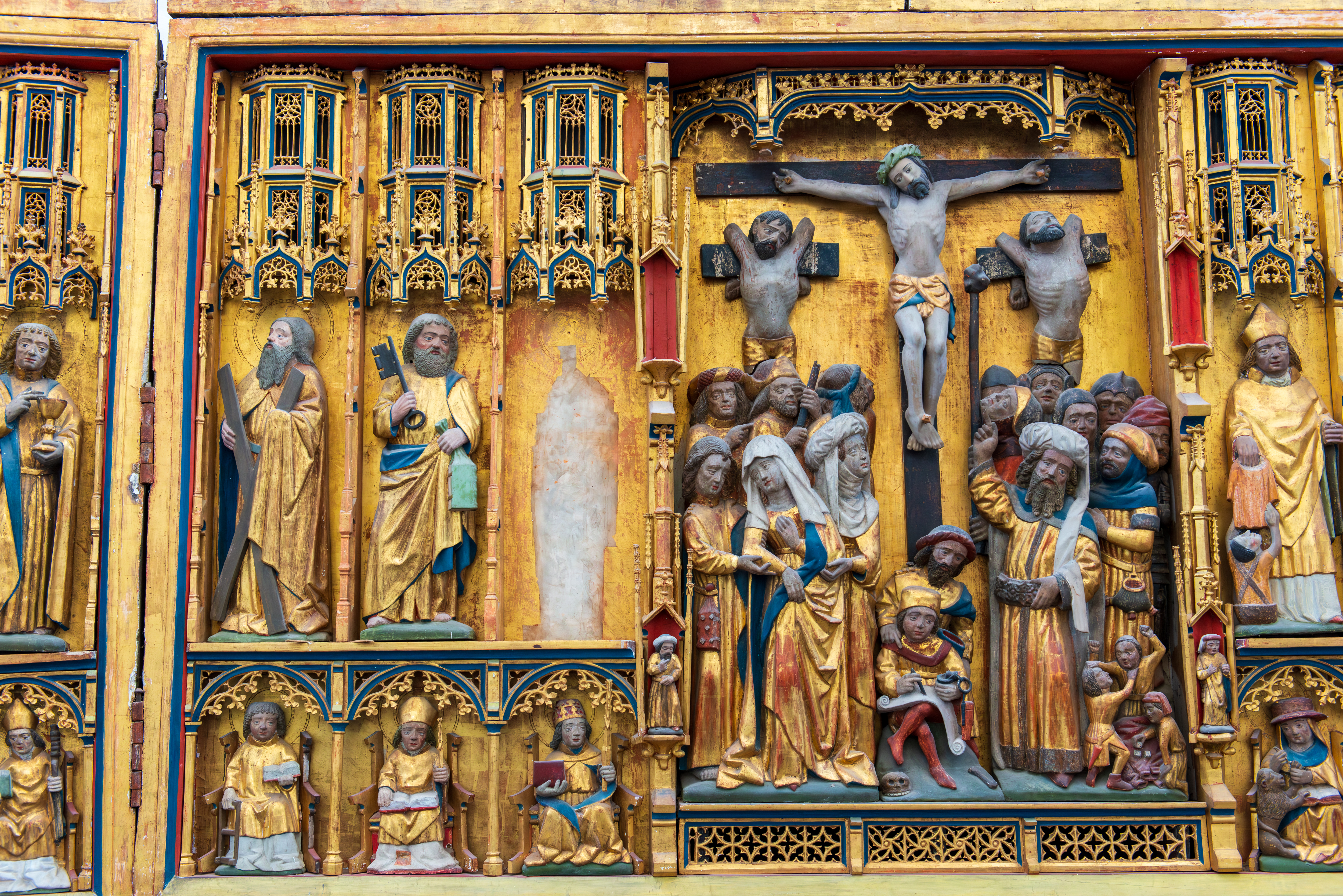 Many European churches have fold out, triptych paintings or carvings, often placed behind an altar. This one was the main altar of the church of Saint Nicolas. The Saint Nicolas Church was badly damaged during the war.