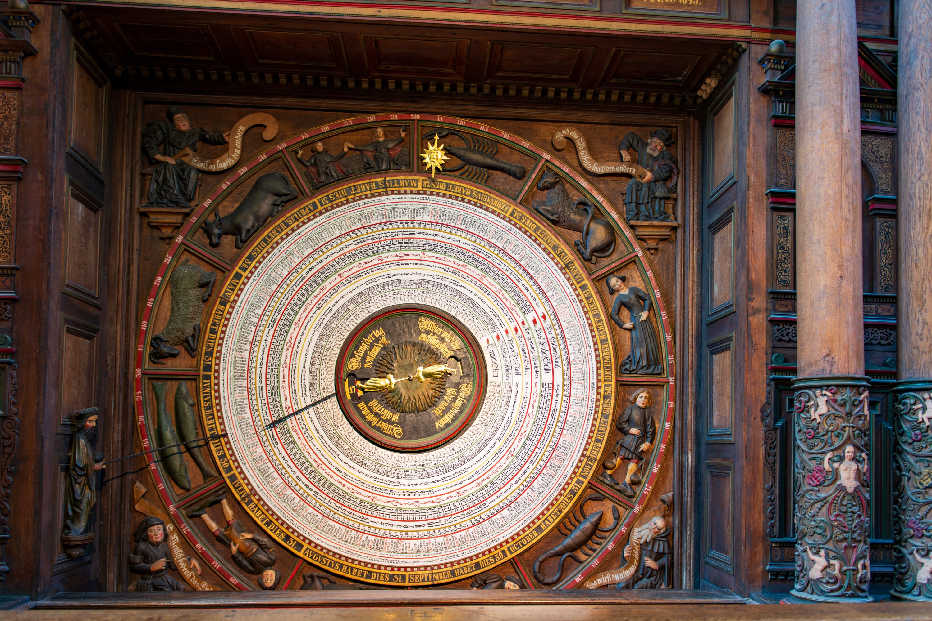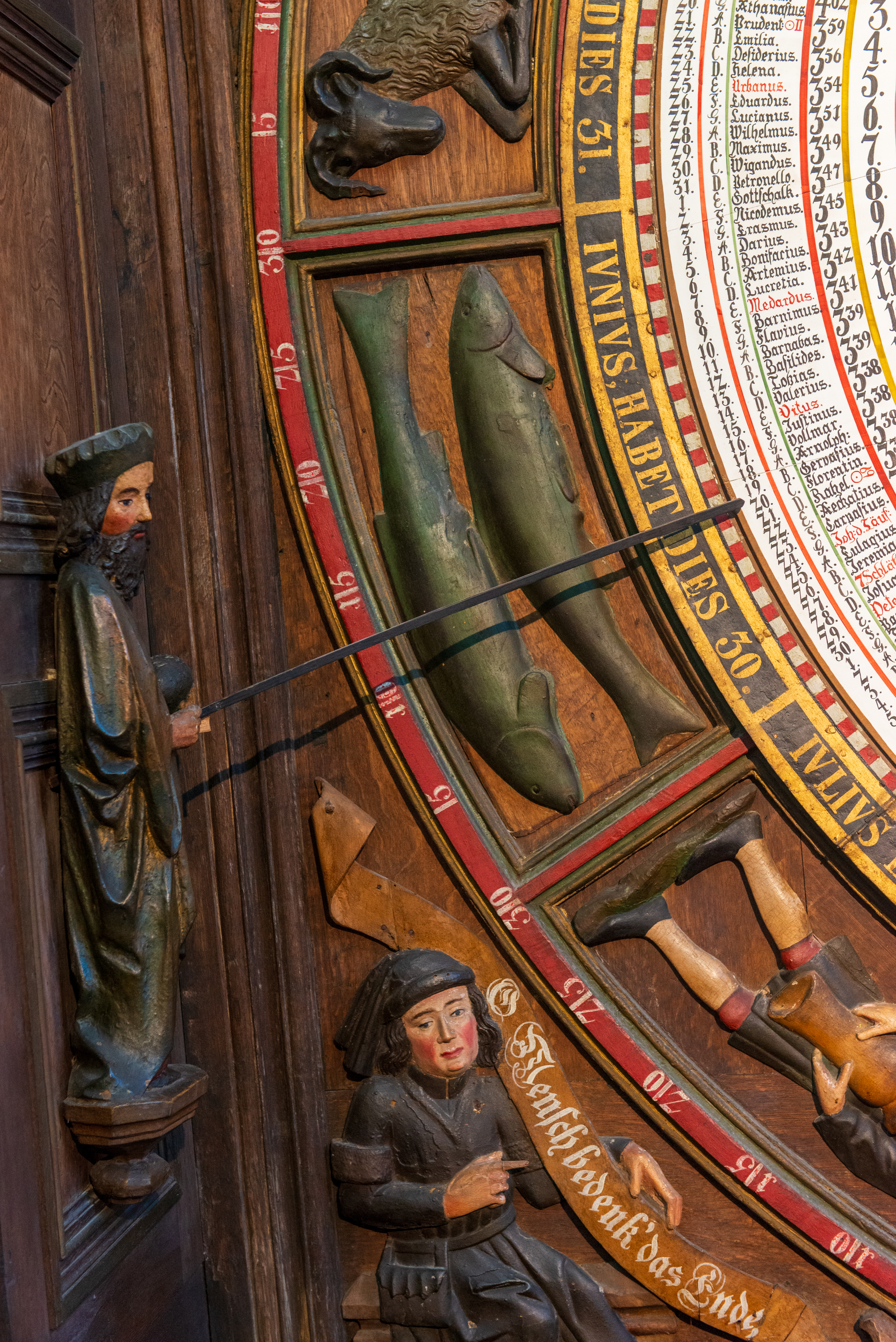 It is wound daily, by hand, and still runs on the original medieval clockwork mechanism, which was restored in 1977. At noon, the Apostles visit the Jesus, but they are so far up, you can barely see them. There there is a calendar plate with information on the day and year, with time, zodiac, solar altitude, and phase of the moon. The calendar plate has been replaced four times.