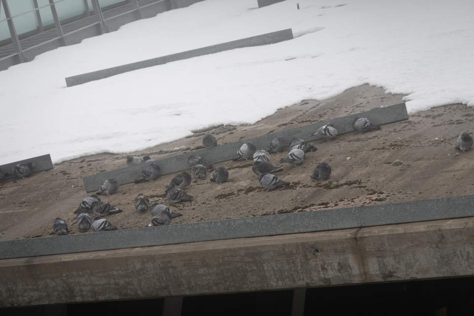 Pigeons, trying to stay warm.