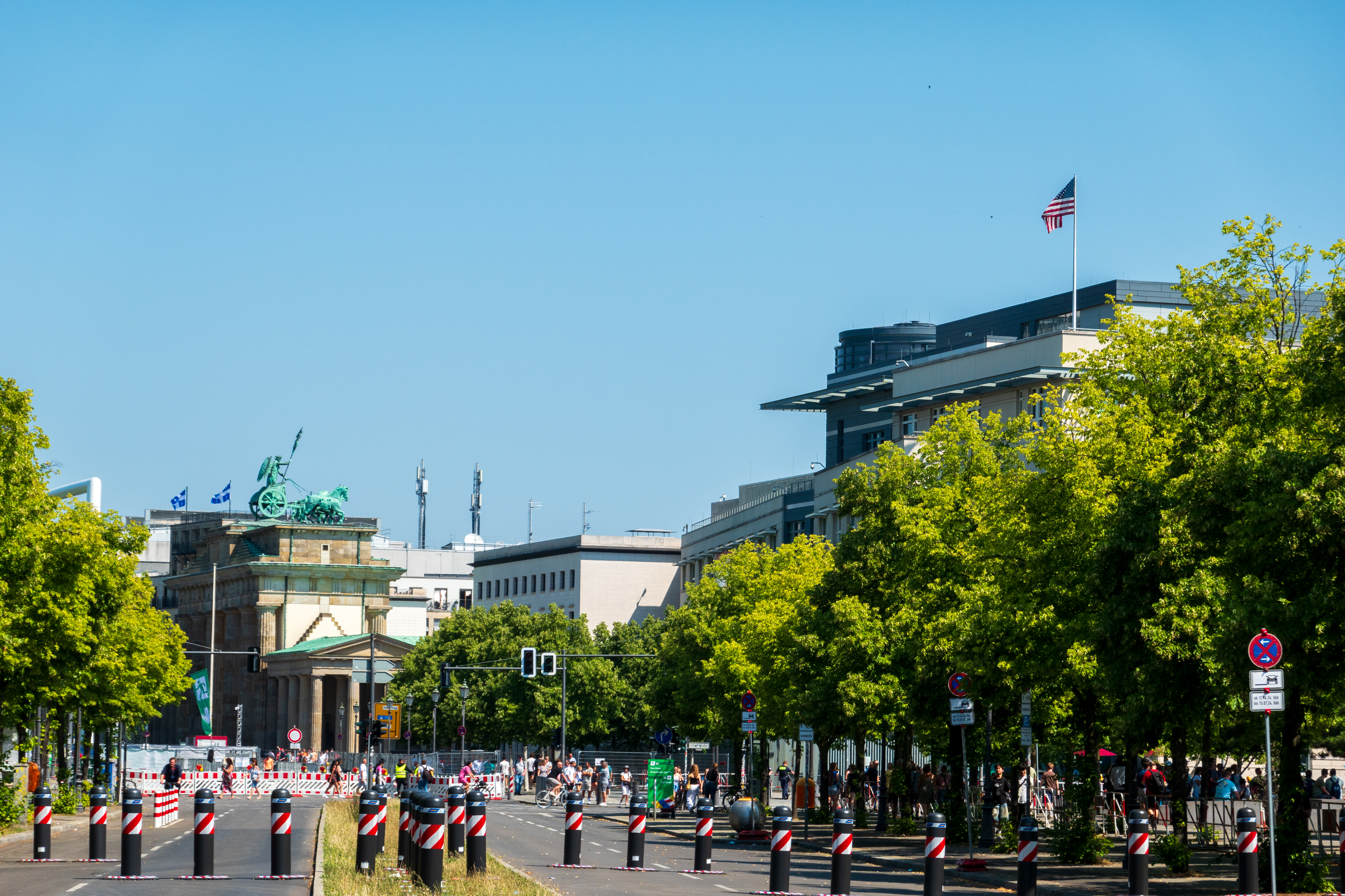 Our actual trip to Berlin began smoothly – the taxi showed up. The ICE (high speed, intercity) train we had booked only took around 40 minutes to get to the Hauptbahnof in Berlin. (Just as well; the air conditioning was struggling!) The Hauptbanhof (main train station) was heaving, but we found our way to the underground train, or U-Bahn, and took one to the Brandenberger Gate. Popping back out into glorious sunshine, we could admire the iconic symbol of Berlin.