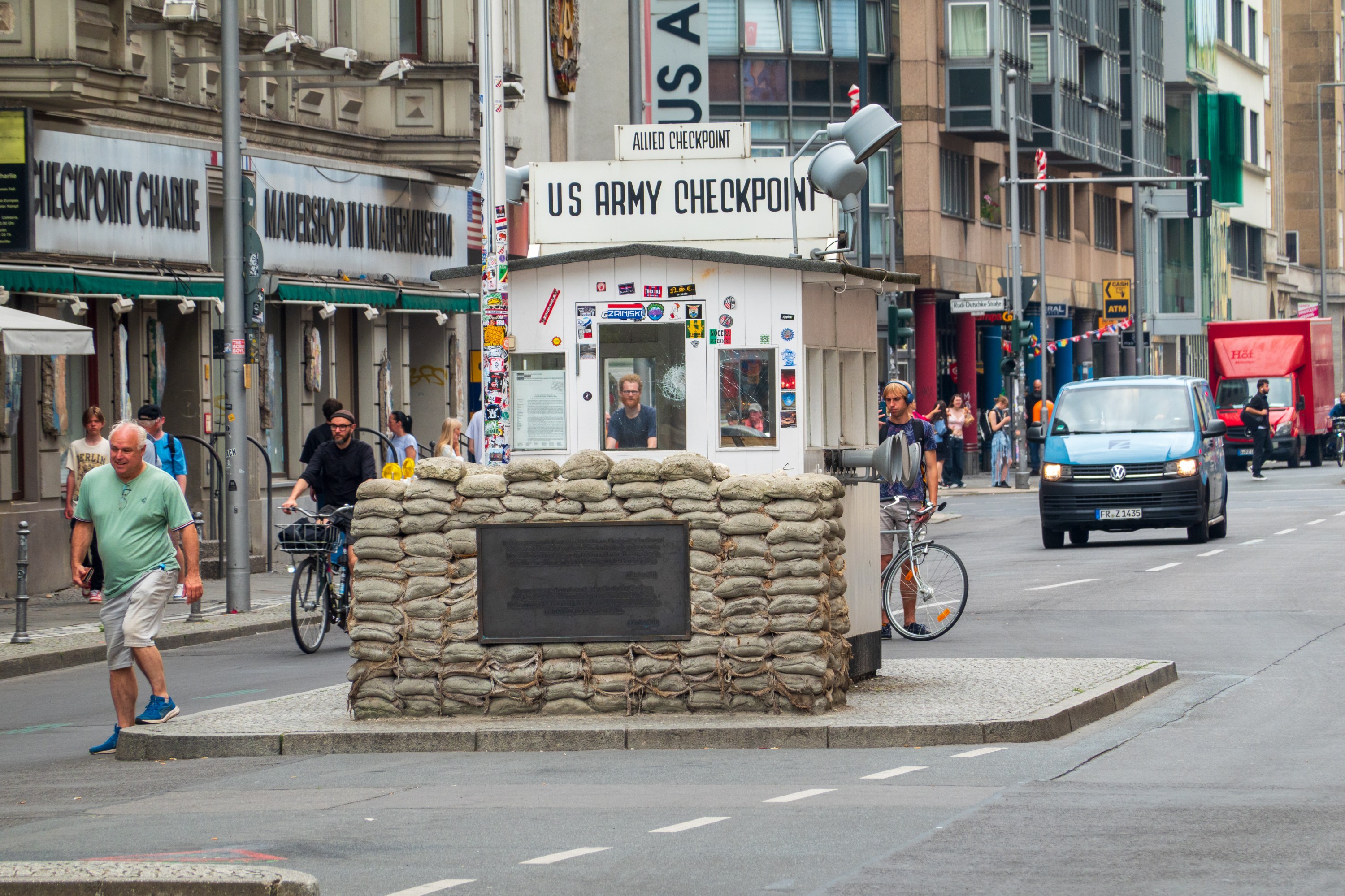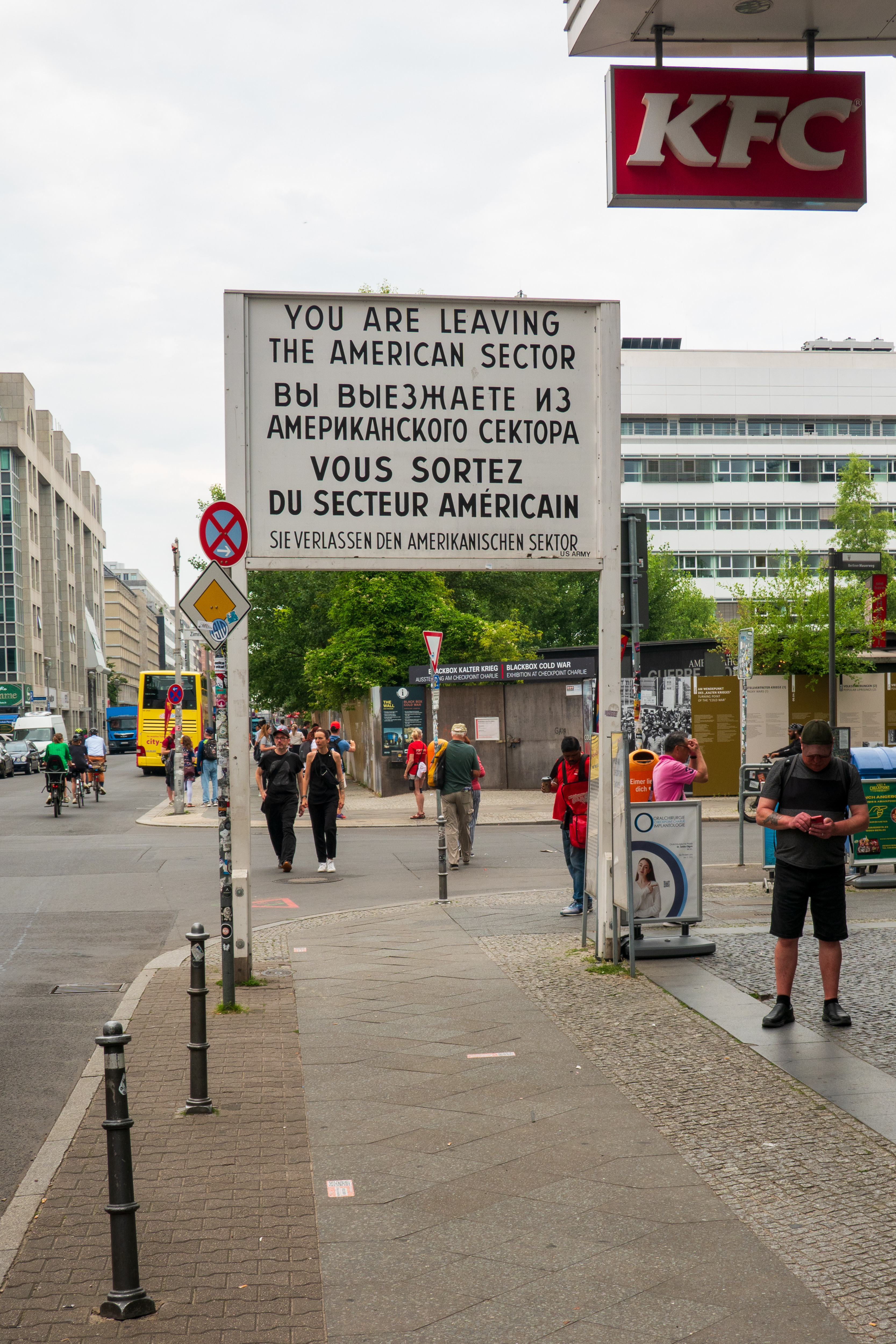 The second day was a little cloudier and while it was cooler we set off to walk to Checkpoint Charlie. The original is in a Museum, which we did not visit, but the copy still sitting in the middle of the street, gave us enough vibe. Happily today, it is merely a tourist trap on a through street.