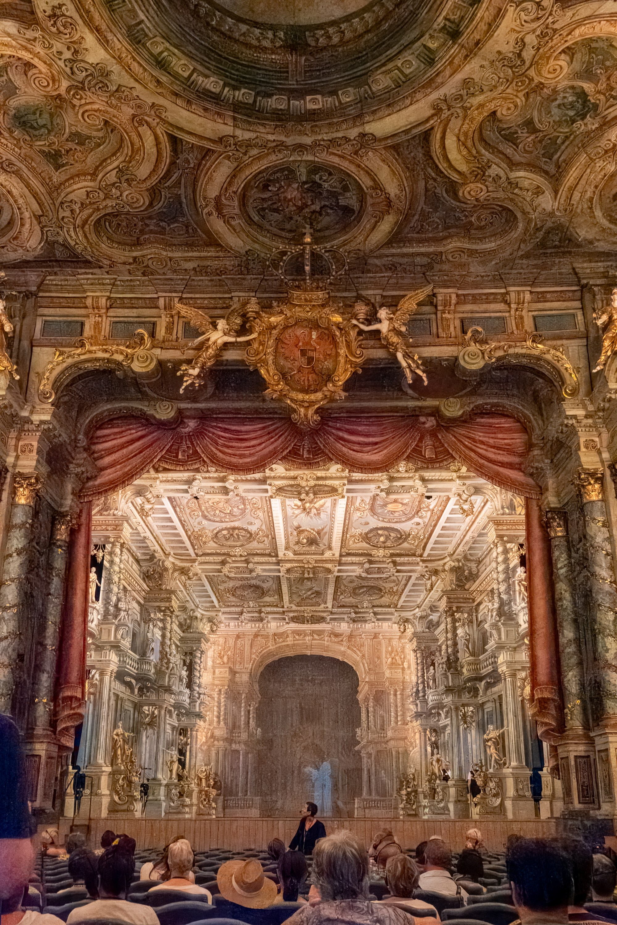 It was intended as a temporary structure, built just like a stage set inside the outer building. It looks like an ornate Italian palace, but it is really just painted wood with trompe d’oeil paintings on broad canvases everywhere. The whole effect is stunning.