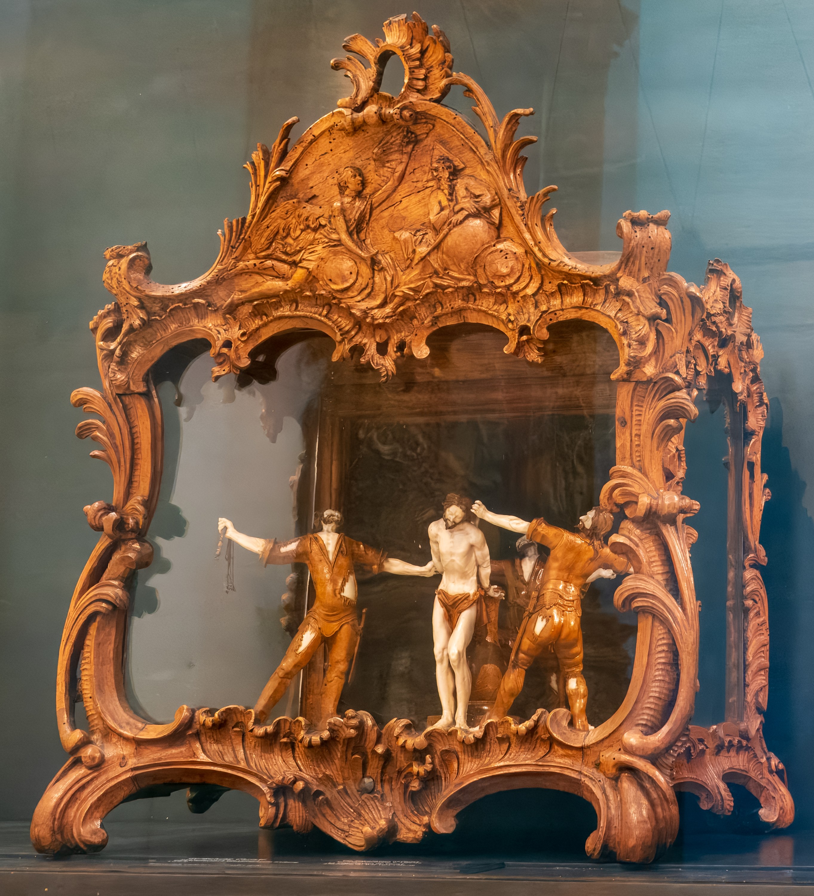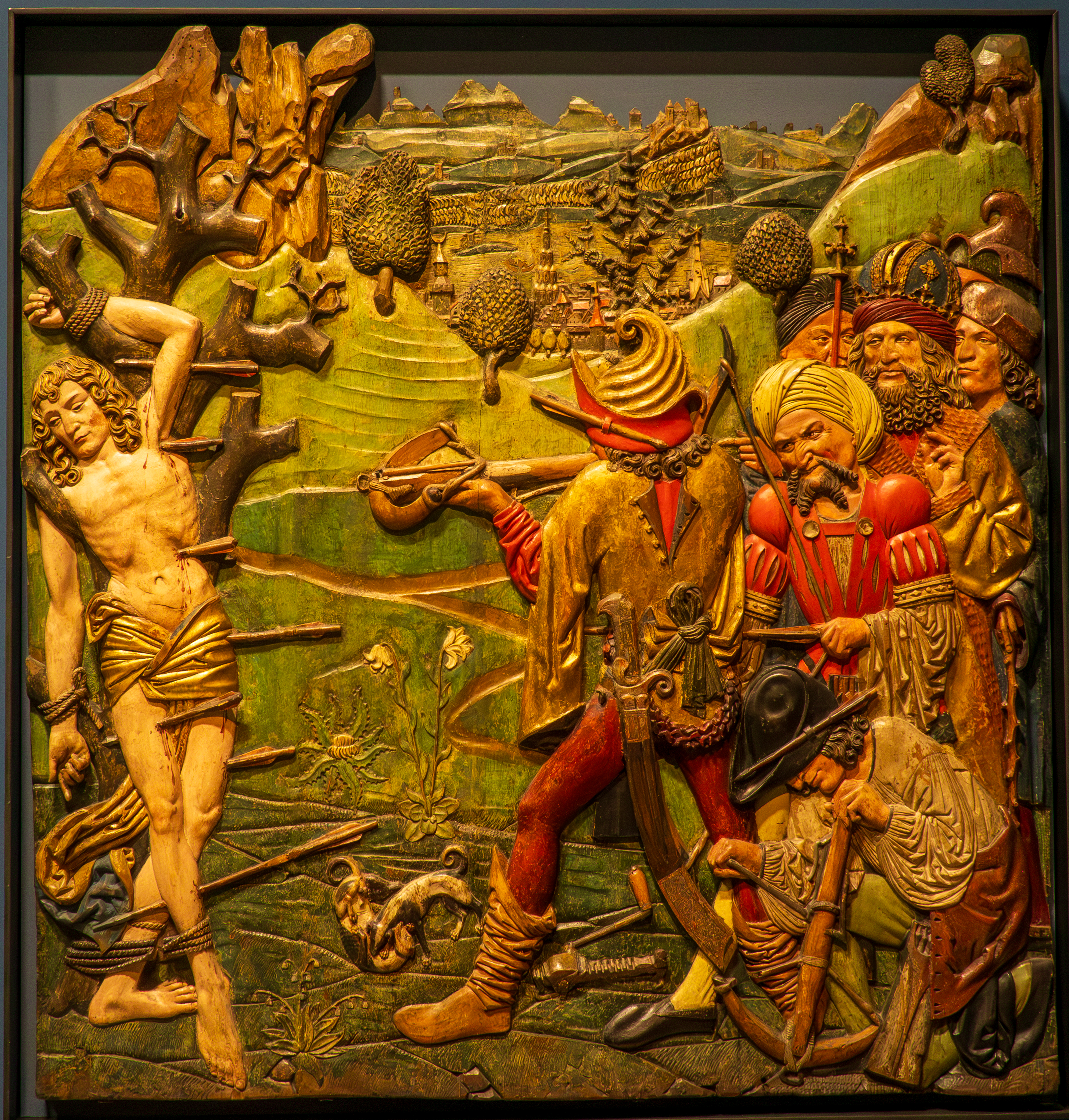 All of the art was beautiful but one piece jumped out – an almost photo realistic carving of the martyrdom of Saint Sebastian. (https://en.wikipedia.org/wiki/Saint_Sebastian) Somebody had way too much time on their hands. Look at those snarky faces! And the two fighting dogs. The cross bows are probably anachronistic, but incredibly detailed, even to the winders. And, for the rest of the story, the saint survived being shot with arrows and, after recovering from his wounds, went back to preaching. This time the emperor Diocletian ordered that he be beaten to death. He did not recover a second time.