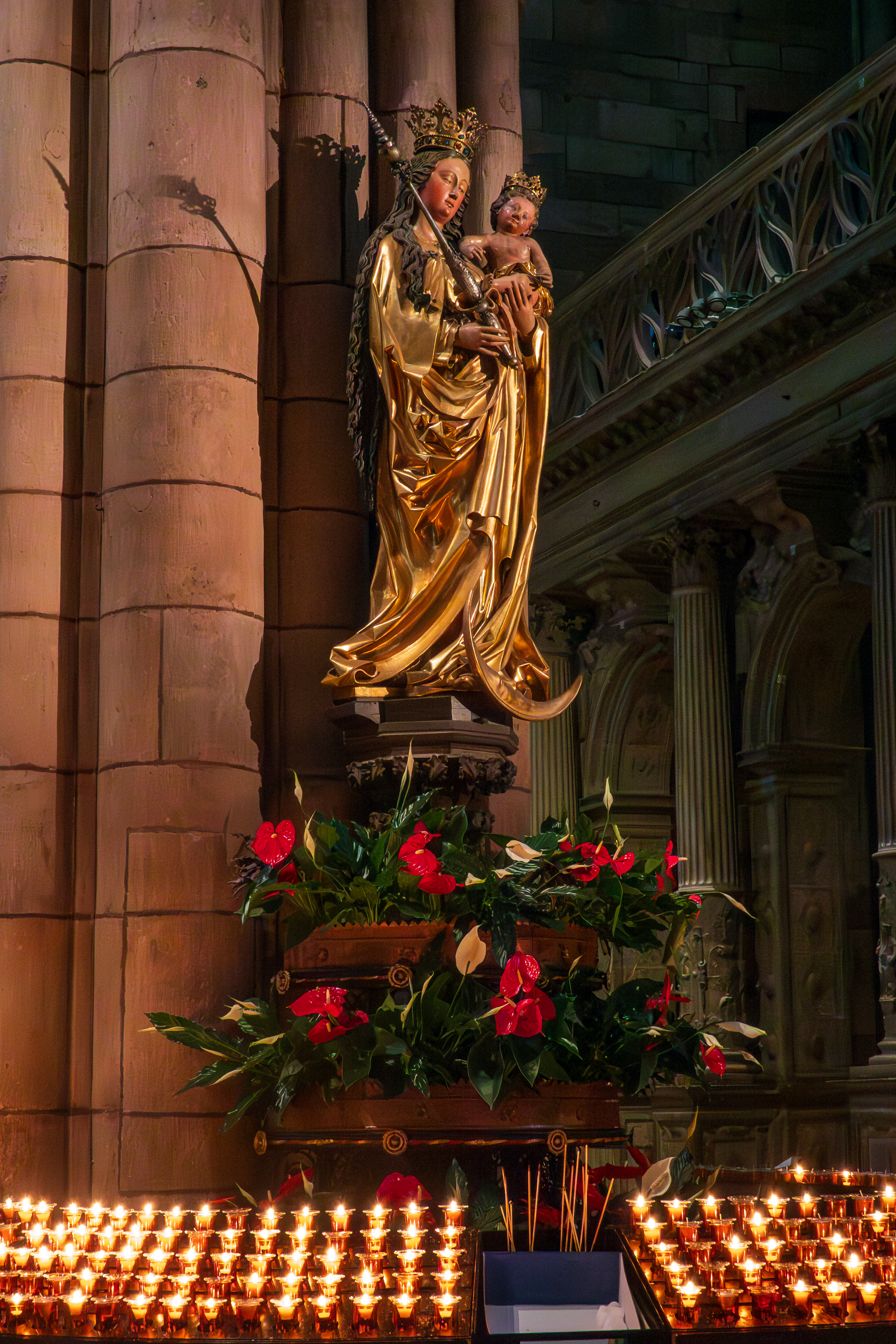 We then visited the Minster and scanned all the statues! We started with the old anti-semitic trope of Ecclesia and Synagoga flanking the entrance. (We had lamented this theme at a previous church.) The former represents Christianity and holds all of the symbols of salvation. The latter represents Judaism and is shown as blind and powerless. Sadly, we have not fully outgrown this stupidity, even in our own country, today. (The lines in the photos are a mesh to protect the statues from pigeons.)