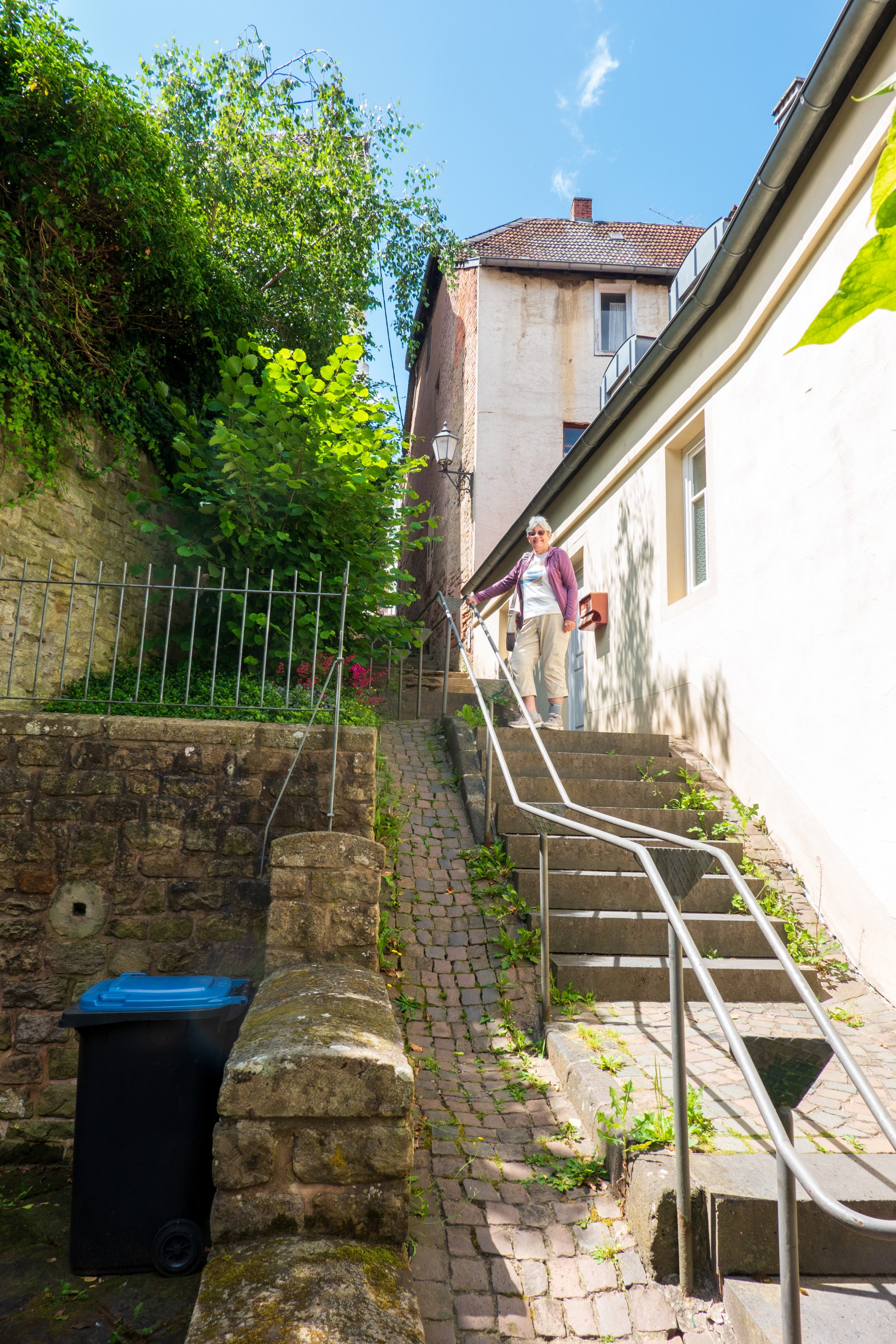 Denise at the front door.Stairs to the upper street.The market square at the top of the street.