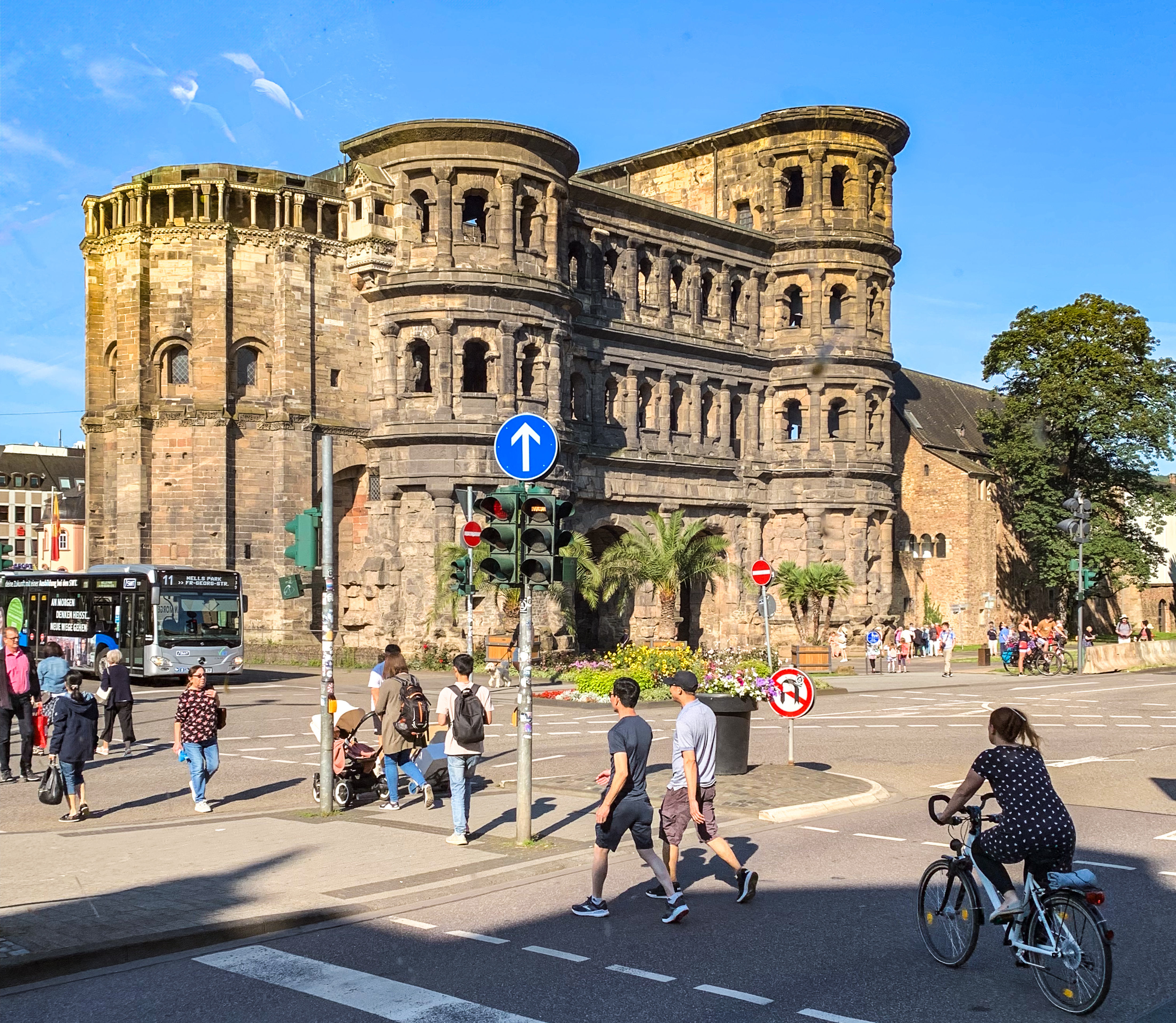 Denise for the win! The market made it impossible to get a decent picture of the Porta Nigra, but then driving out of town we stopped at a traffic light and Denise scored this with an iPhone! (https://en.wikipedia.org/wiki/Porta_Nigra)