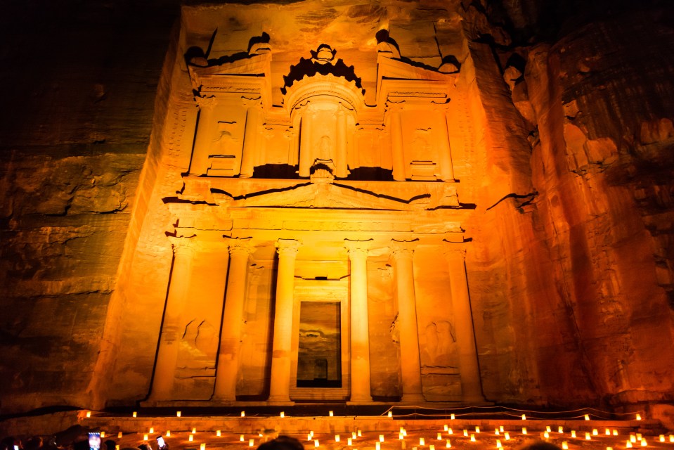 Treasury under rose flood lights.
