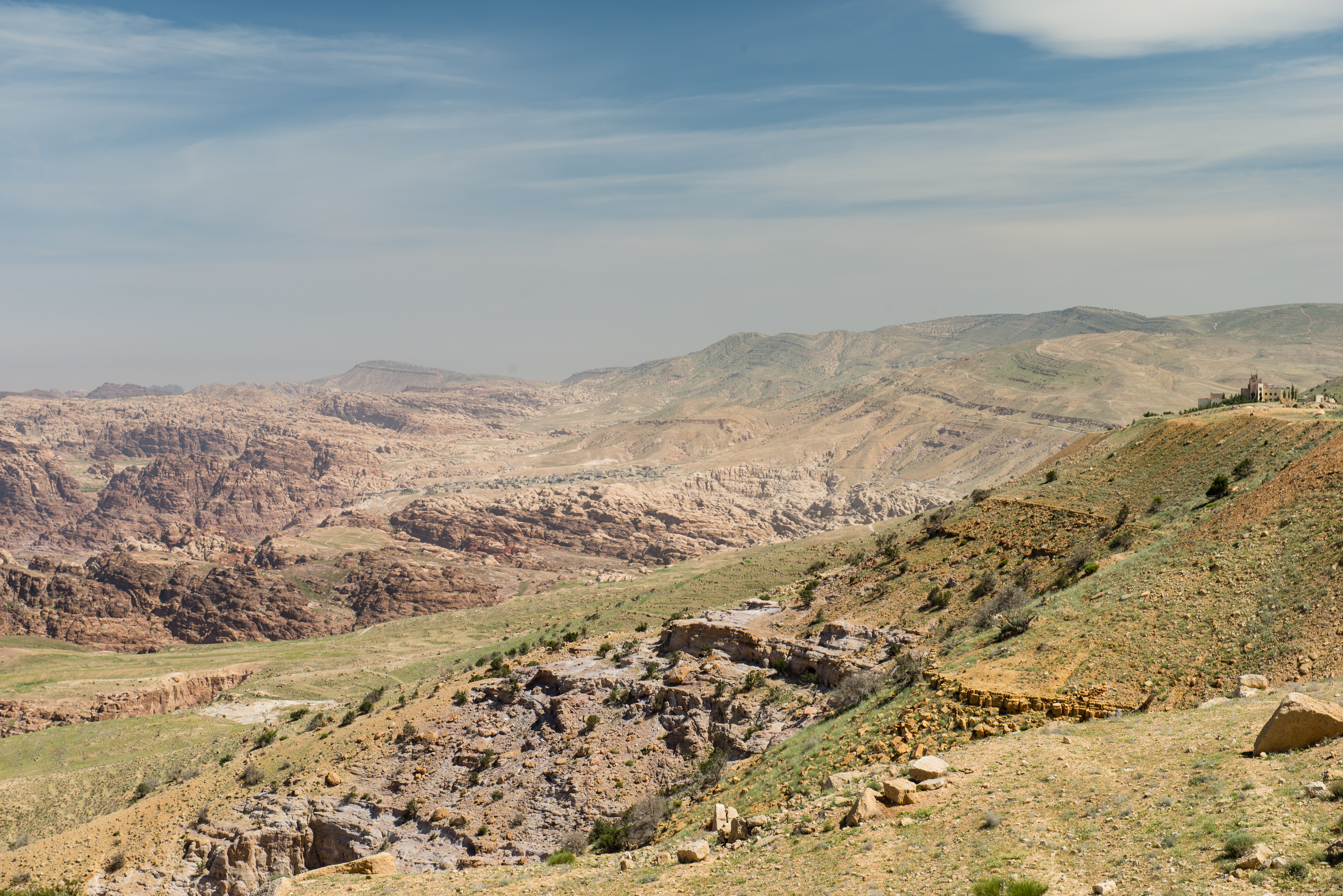 Wadi Musa from the Highway ← Previous Next → Looking back at Wadi Musa, the green patch in the center. Petra is down in the mountains to the left.