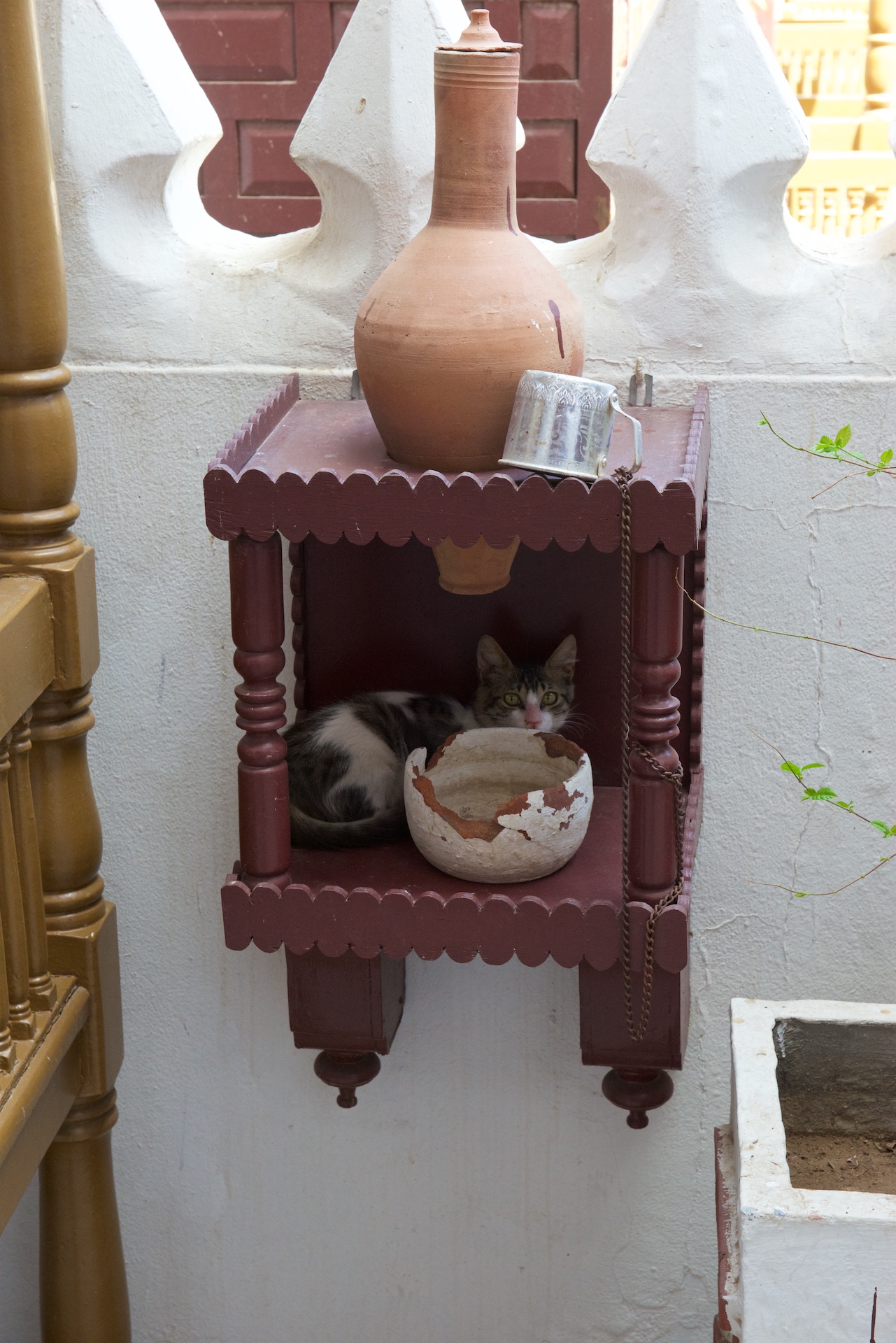 Drinking Fountain ← Previous Next → Traditionally, you put fresh water in the pot and it filters through into the cut, cooling by evaporation. The cat is optional.